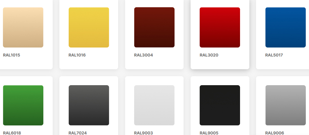 Витрина доступна в 10 стандартных цветах фронтальной панели (RAL): 9003, 9005, 9006, 1015, 1016, 3004, 3020, 5017, 6018, 7024.
