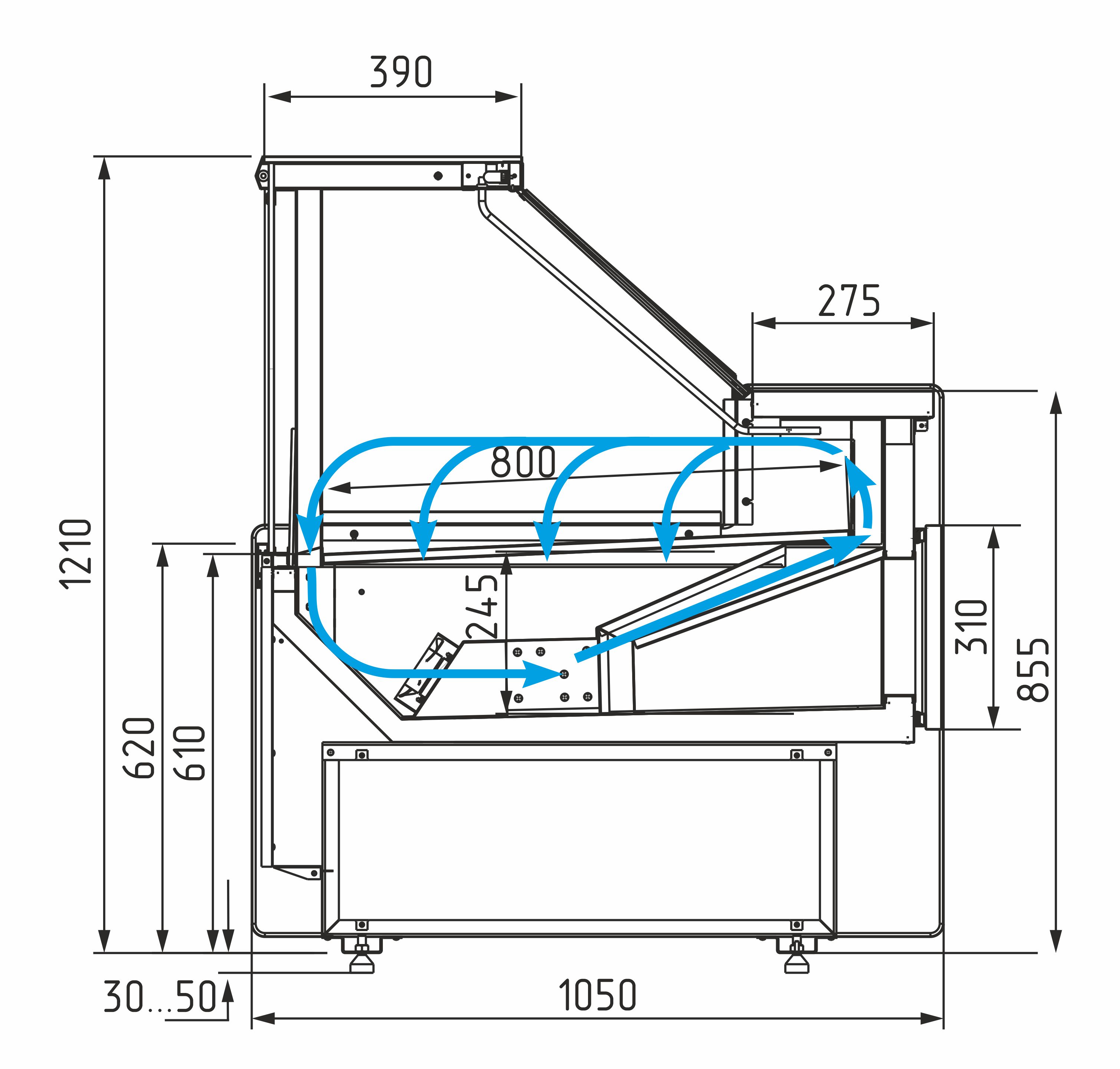 Экспозиционная поверхность и столешница изготовлены из шлифованной нержавеющей стали, декоративная фронтальная панель — из МДФ.