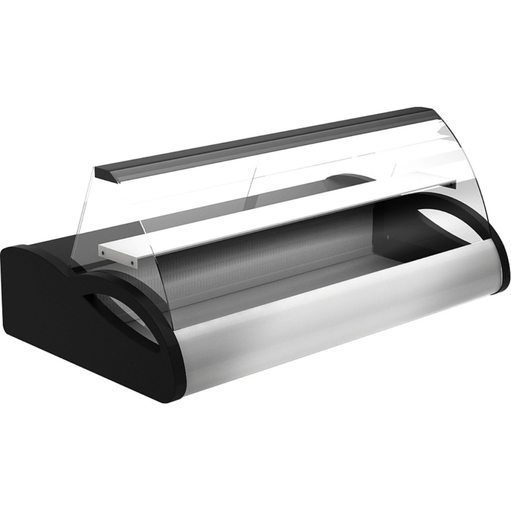Модель оснащена гнутым передним стеклом, неохлаждаемой верхней полкой и ночными шторками из органического стекла, которые защищают продукцию после закрытия. Витрина изготовлена из стали с ППУ-теплоизоляцией, а элементы, контактирующие с продукцией (передняя обшивка, столешница и полка), выполнены из нержавеющей стали. Боковины изготовлены из прочного чёрного пластика.